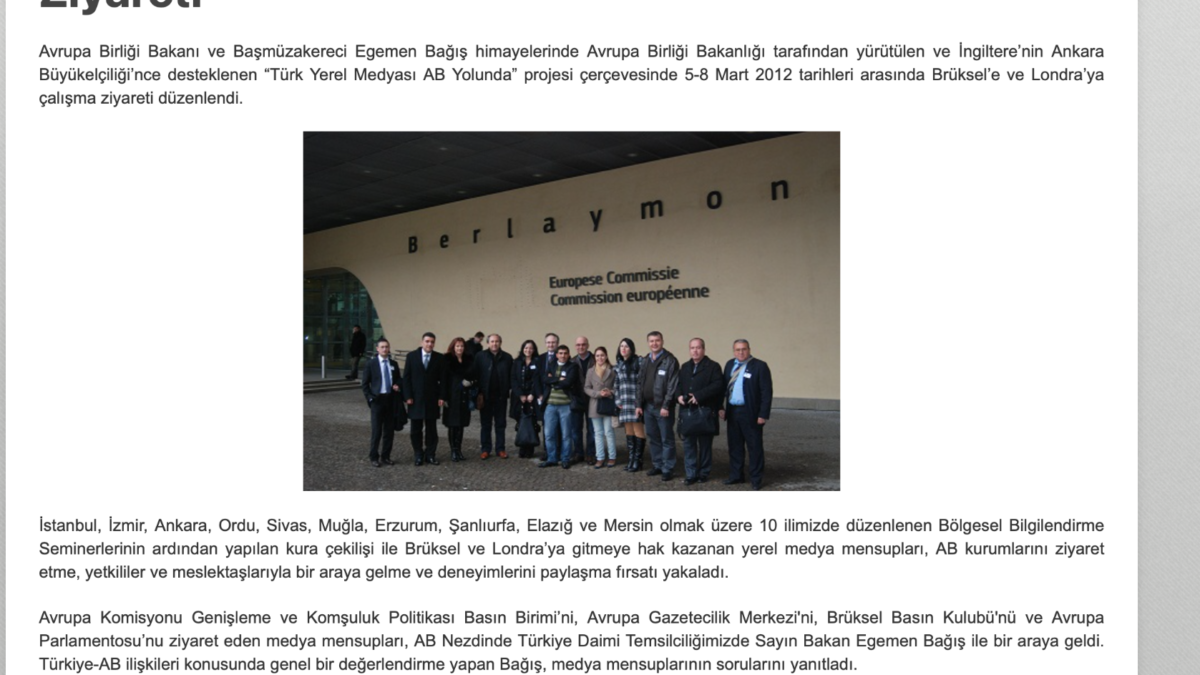 As part of the “Turkish Local Media on the Road to the EU” project, carried out by the Ministry for European Union Affairs under the auspices of Egemen Bağış, Minister for EU Affairs and Chief Negotiator, and supported by the British Embassy in Ankara, a study visit to Brussels and London was organized between 5–8 March 2012.